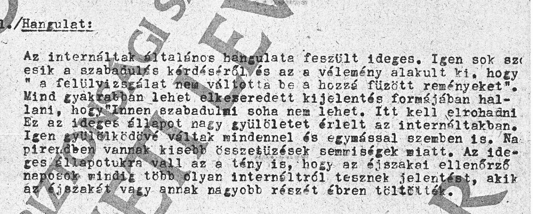 „Jelentem, hogy Felhalmi Lujza és Pálinkás Jánosné internáltakat a f. hó 27-én kelt jelentésemben szerepelt indokok alapján az operatív csoport vezetőjével történt megbeszélésünk alapján kettő, illetve három hónap egyszerű magán elzárással fenyítettem meg. Tekintettel arra, hogy a megengedett fenyítést túlléptem, azt 40-40 napra változtattam át, aminek végrehajtását kérem engedélyezni. Az ilyen formában történő elkülönítésük a többi internálttól operatív szempontból is szükséges.”